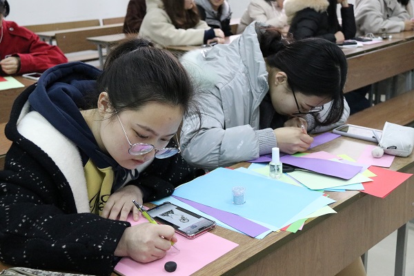 除了让人印象深刻的观影活动,其余的活动也在如火如荼的展开。大家踊跃参加,现场气氛活跃热烈。编发活动现场,女生们在学习编发技巧的同时,相互交流分享平时生活中的编发经验。通过多变的发型与巧妙的编发手法,展现青春的张扬与美丽。另一边,女红工作坊的同学也开始了她们的美妆教程。粉底、睫毛膏、口红、眼影……化妆工具种类所含甚多。在女红同学的精湛技艺下,一张张仙女的面孔陆续绽出。紧接着,心灵手巧的女生们也开始了手工DIY大赛。一张张栩栩如生的剪纸,一幅幅充满春意的贴纸,展现了女生们别样的风采。活动最后环节,一念瑜伽社团的会长带领大家进行了几组瑜伽练习,用瑜伽唤醒身心,激励同学们在忙碌的学习生活中不忘身心锻炼,增强体质,促进身心健康。活动结束后学生会成员将男生们写的祝福卡片献给女生们,把祝福传递给每一个女生,并和所有到场女生合影留念,记录这一美好的时刻。