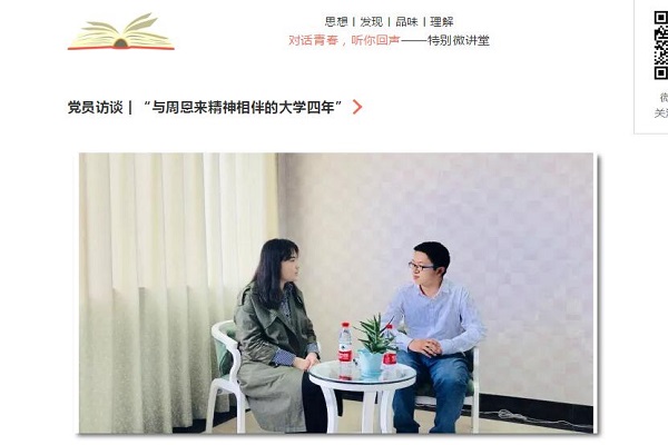 数科学院于6月中旬开始,在院微信公众号上定期推送“党旗引领青春路”系列对话报道。学院记者团精心策划,组织优秀的党员进行两两访谈,对话青春、对话梦想。访谈采取多种创新型主题模式展开,如宋欣露与张睿围绕“如何践行周恩来精神”对话,胡鑫宇和赵宁宁则从大学四年的心路历程出发进行对话。