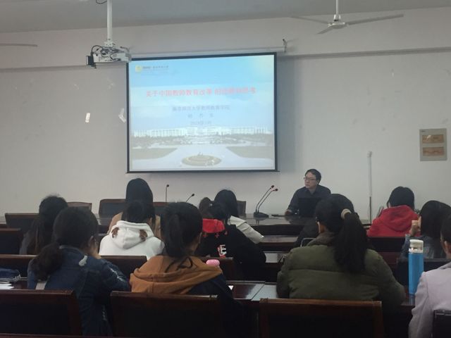 杨教授主要从师范教育到教师教育的发展历史、三级培养到二级培养的模式改革以及教育部和党中央的高度重视等全方位阐述中国教师教育的发展历程,指出目前教育存在的诸多问题,而这些问题恰是我辈教师的发展契机。杨院长鼓励大家以四有教师为基本原则,力争成为中国21世纪教师教育发展的弄潮儿。