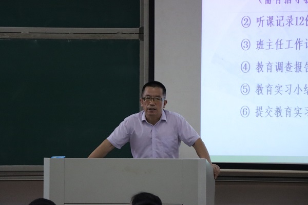实习指导老师代表郑庆全老师向同学们讲述了教育实习的要求,要注重教育理论学习、教育见习和演习。他希望同学们在实习过中要端正实习态度,拥有批判性思维,并且可以及时请教指导老师,能够正确处理与指导老师以及所带班级学生的关系,完成工作任务的同时做好自身的安全防护工作,能够圆满完成实习任务。