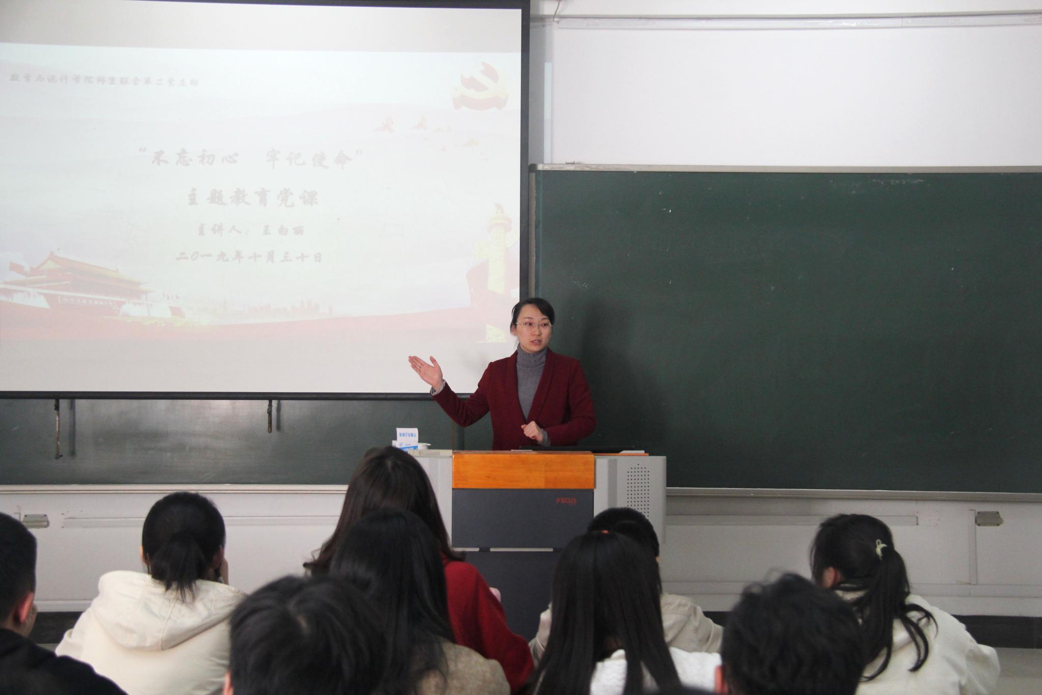翔宇网10月31日电(记者王雪 杨轲旭)为提高党员政治素养,学习党的初心和使命,10月30日,数统学院师生联合第二党支部在理南203开展学生党员“不忘初心、牢记使命”主题教育党课。本次党课由该党支部书记王白丽主讲,2016级全体学生党员参加。