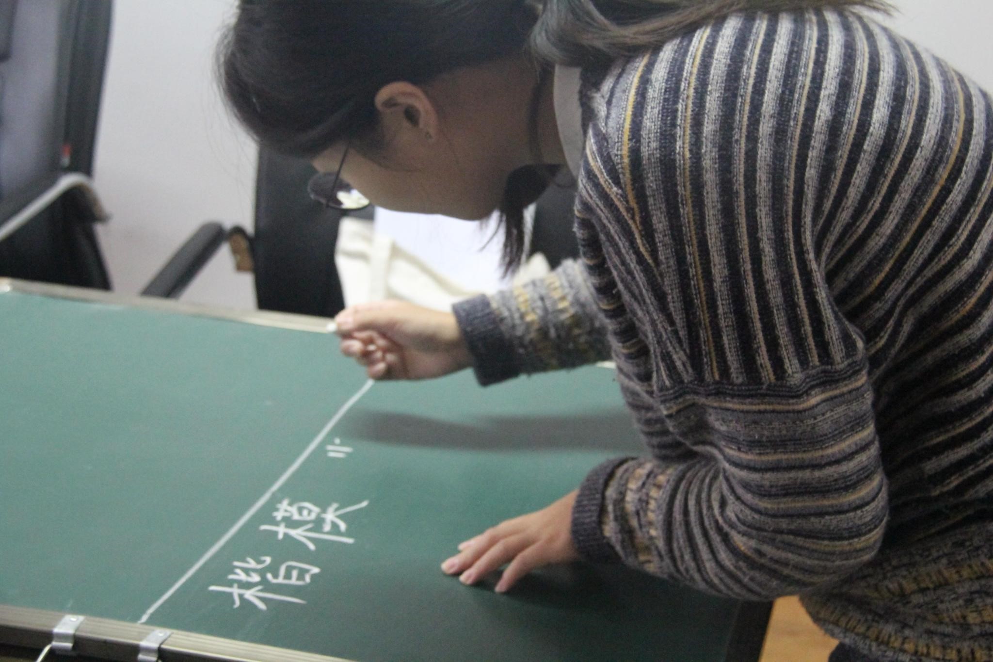 马强在理论教学中指出,粉笔字书写要注意汉字笔画、间架结构、书写章法,书写时身子要站稳,粉笔不可垂直于黑板,务必做到一气呵成、力送笔端。