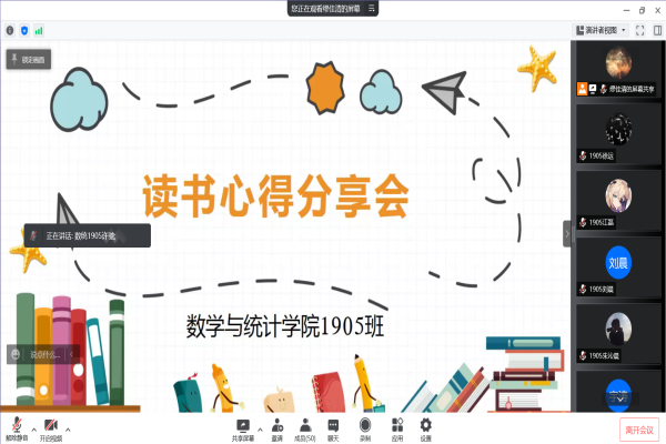 翔宇网4月5日电(记者 徐运)为进一步营造浓郁的学习氛围,塑造内涵丰富、特色鲜明、品位高雅的班级文化,提升班级学生的综合素质,培养大家多读书、读好书、勤交流的良好习惯。数统1905班于4月4日开展线上读书分享会活动,本次活动由徐运主持,全体团支部成员参加。