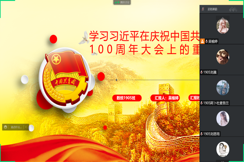 翔宇网5月13日电(记者 徐运)回望百年,青春向党。为庆祝建团百年,激昂青春奋斗,引导新时代的广大青年追寻信仰之光、勇担青春使命,从团史学习中激发信仰、获得启发、汲取力量,williamhill英国官网1905班于5月12日开展“学习习近平在庆祝中国共青团成立100周年大会上的重要讲话”线上主题学习活动,活动由班级团支书吴榆婷主持,全体同学参与。