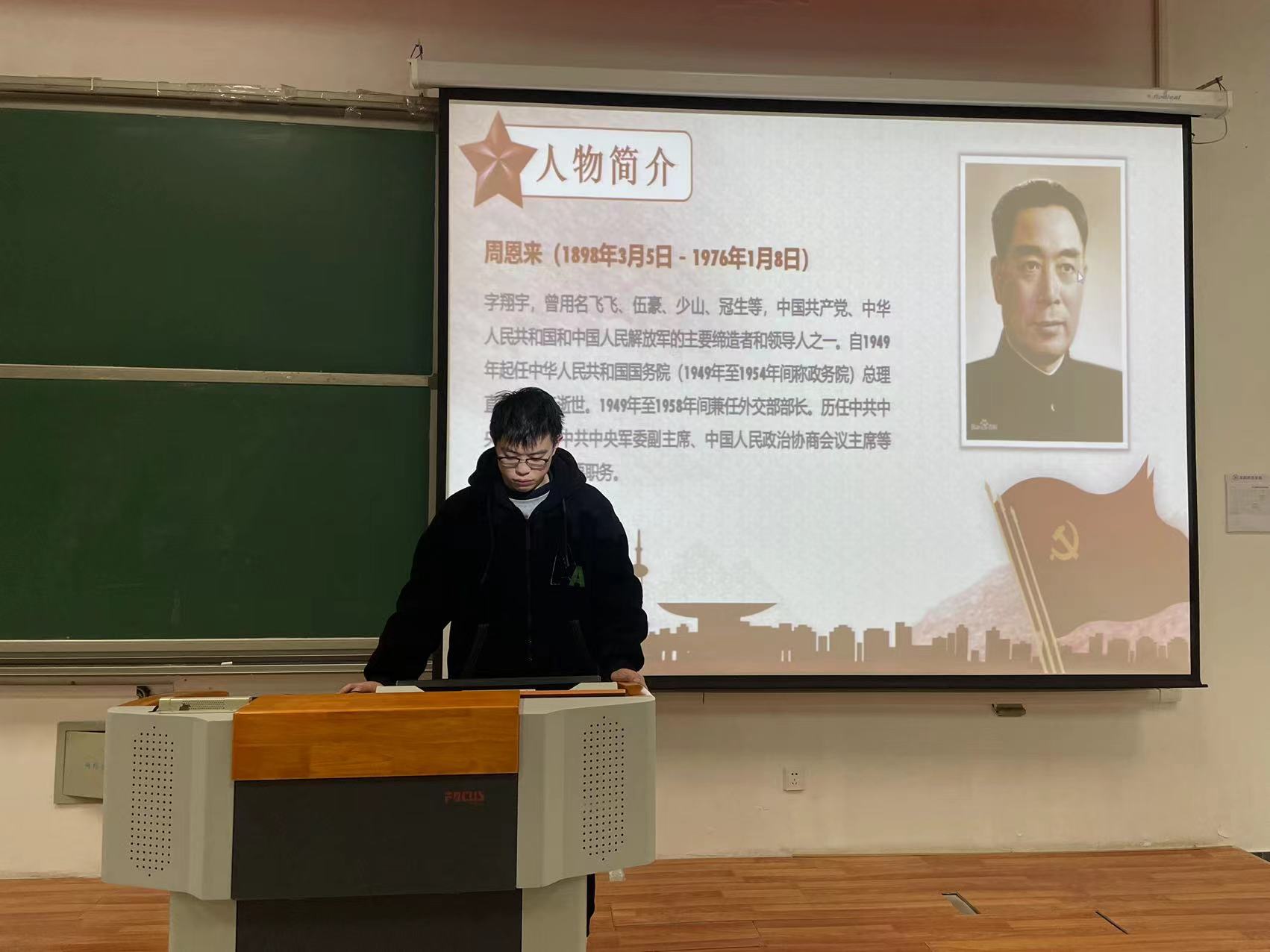 活动伊始,通过班委来组织大家开展读书交流会,积极阅读并学习周总理事迹的相关文献和书籍。调动班级团支部和“周恩来班”活动小组,采取线上与线下相结合的方式,通过召开主题班会在班级中积极宣传恩来精神,逐步凝练出班级特色,不断提高大学生的先锋带头作用,时刻以恩来精神严格要求自己。同时课后又通过走访周总理纪念馆、观看周总理电影、誊写周总理的诗句、制作书签和贺卡等丰富多彩的活动纪念周总理。