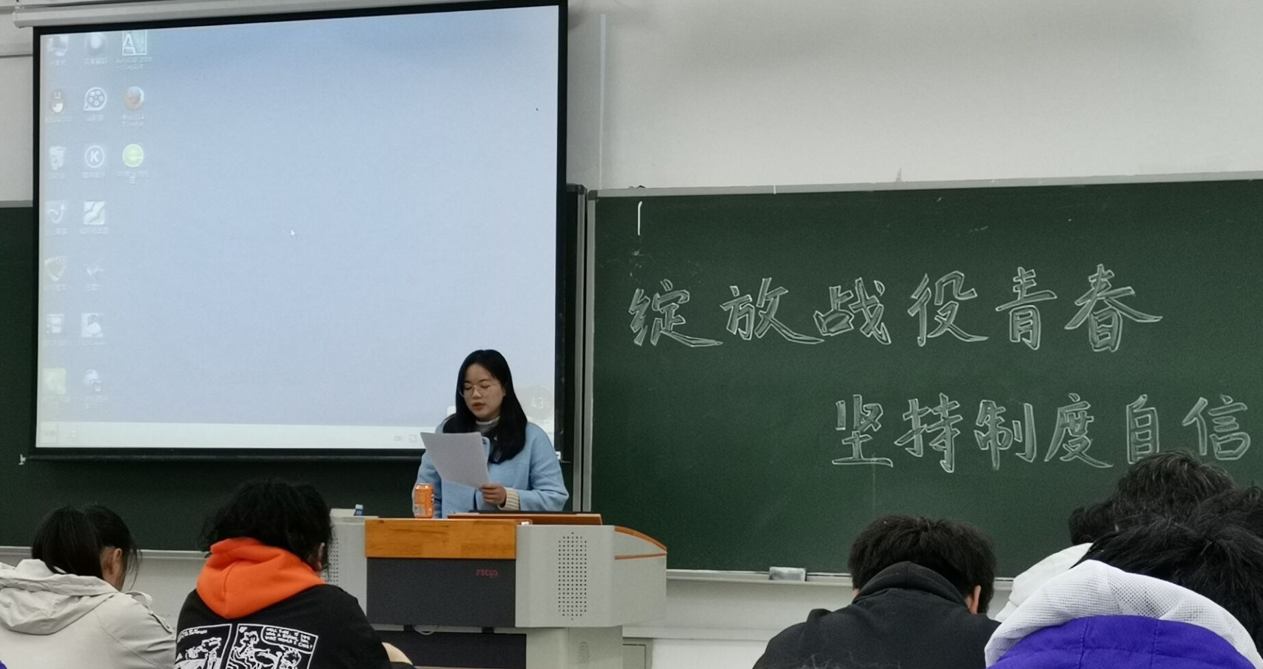 翔宇网11月12日电(记者 张雨倩)青春因磨砺而出彩,人生因奋斗而升华。为使同学们坚定理想信念,练就过硬本领,投身强国伟业,数统学院1804班大三学生携手2003班大一新生于11月11日晚在理南106开展“绽放战疫青春,坚定制度自信”班团活动。