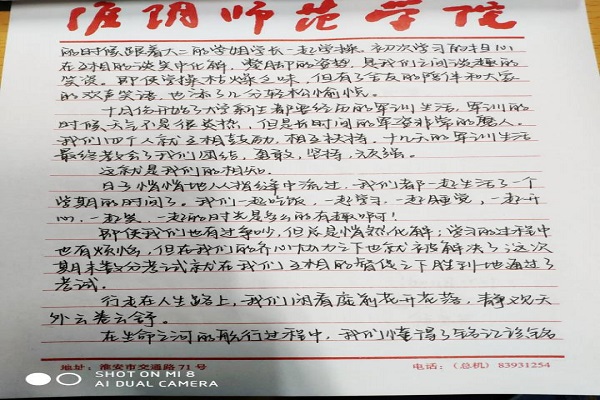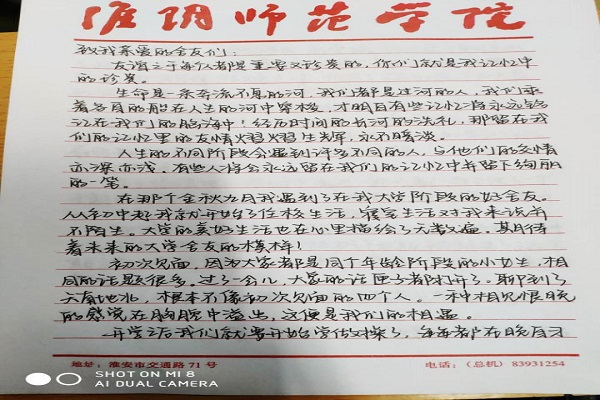淮师新闻网3月28日电(记者 刘雪宁)在大学,室友是我们生活的伴侣,是我们的情感寄托,但在日常生活中点点滴滴的小事中难免不存在一些小矛盾。数学科学学院心理联合部组织开展“相遇及相知”写给室友的一封信的书信比赛,为同学们提供情感表达的场所,发现、思索及巩固室友情谊,让同学们通过文字的形式与自己的室友敞开心扉,倾诉心语,促进寝室成员之间内心深处的沟通,营造寝室文明、健康、温馨、和谐的氛围。