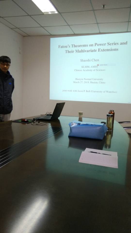 陈绍示副研究员的报告介绍了Fatou关于形式幂级数的有理-超越二分定理,以及报告人与合作者关于Fatou定理的多变量推广和在D-finite形式幂级数上的推广。他的报告深入浅出,既有理论深度,又详细地介绍了问题的背景。陈绍示副研究员还介绍了一些他的研究心得。他的报告让大家受益匪浅。报告会在一片掌声中结束。