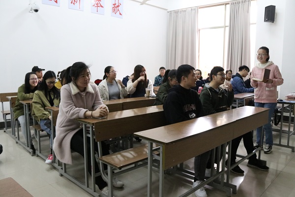 活动伊始,主持人章若曦宣读活动流程。活动第一项“勤学——青春聊吧”。主持人通过PPT展讲的方式,将统计专业考研形势做了深度分析,还邀请了18年考研学姐学长,分享学习方法,让同学在考研、学习、就业等方面有了清晰认识。