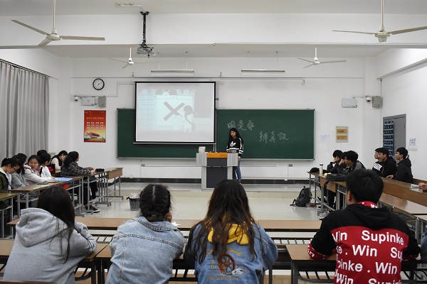 活动伊始,由主持人朱烨进行开场白,介绍此次活动的目的、意义以及活动的大致情况与流程。接下来是以网络诈骗为主题的PPT展示环节,1804班龚千千同学讲述了生活中常见的16种诈骗方法并提出了合理的补救措施。随后,1804班李虎,施圣等同学带来了以诈骗为主题的精彩的情景剧表演。讲述了一段“老丈人与姑爷化解误会,认清电信诈骗”的故事,既有温馨的家庭故事,又有防止老人被骗的现实投射。他们配合默契、观众气氛热烈。剧本台词紧扣主题、语言和谐,赢得了大家的一致好评。