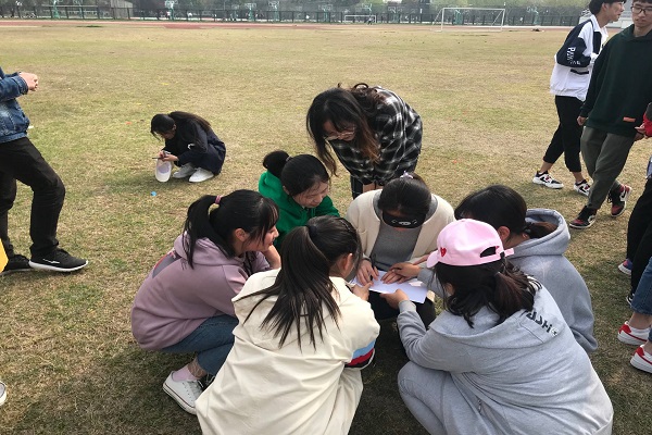 活动伊始,班级同学自由结合分为八组。活动第一项“驿站传书”,同学们通过肢体语言传递信息。做动作、比手势、用表情,同学们想尽办法向队员们传递信息。每组队员竭尽全力用最快速度传递最准确的信息。
