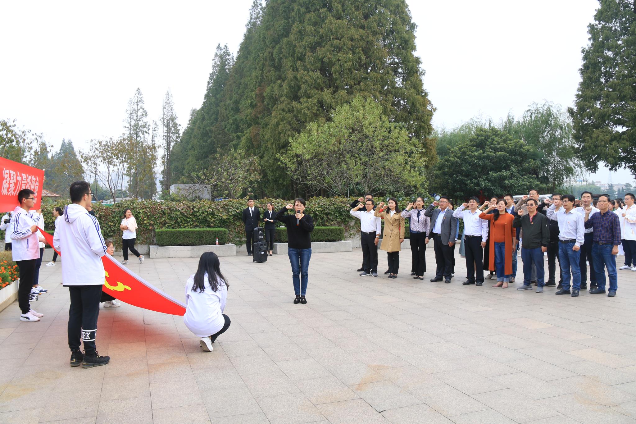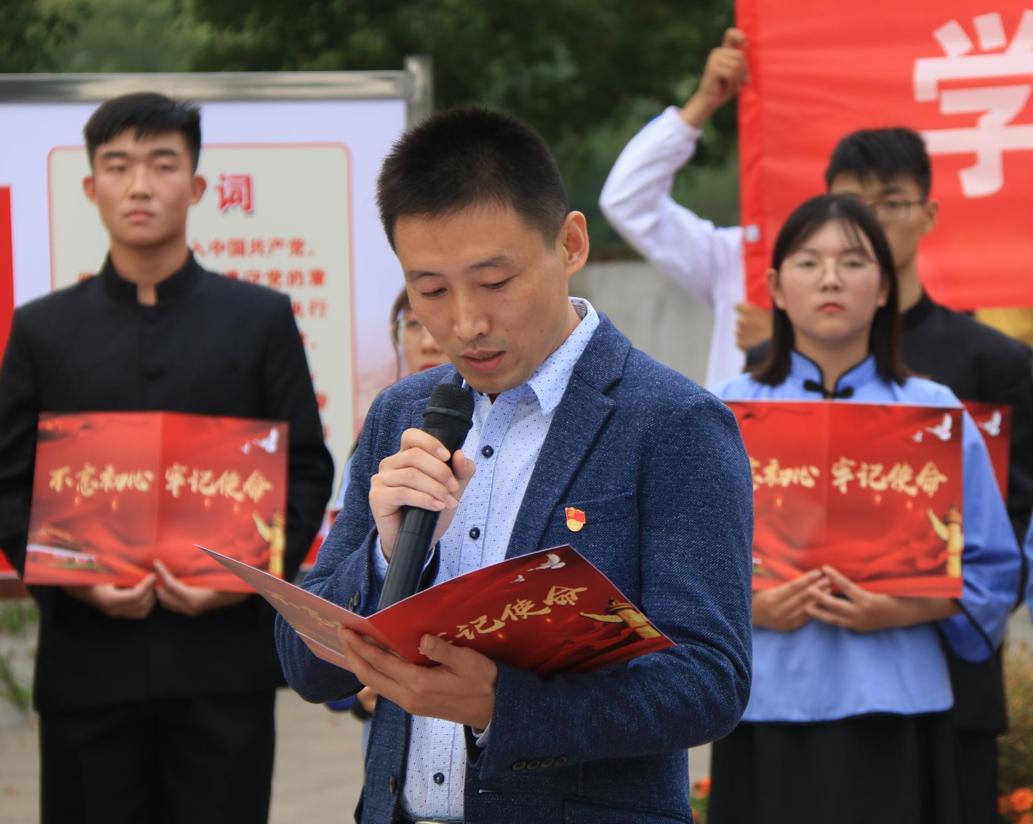 师生党员代表讲初心、明使命,分别从教师与学生的身份阐述对初心与使命的理解。教师党员代表张海辉指出,我们要从伟人的足迹中感受与承接能激励我们不忘初心、牢记使命、永远奋斗的巨大精神力量。学生党员代表1706班陶烨同学在发言中呼吁,要学习周总理鞠躬尽瘁死而后已、不忘初心有始有终的精神,肩负时代赋予的使命与责任。王白丽带领全体教师党员,面向党旗,紧握右拳,重温入党誓词,在庄严的氛围中表达守初心、担使命的决心。