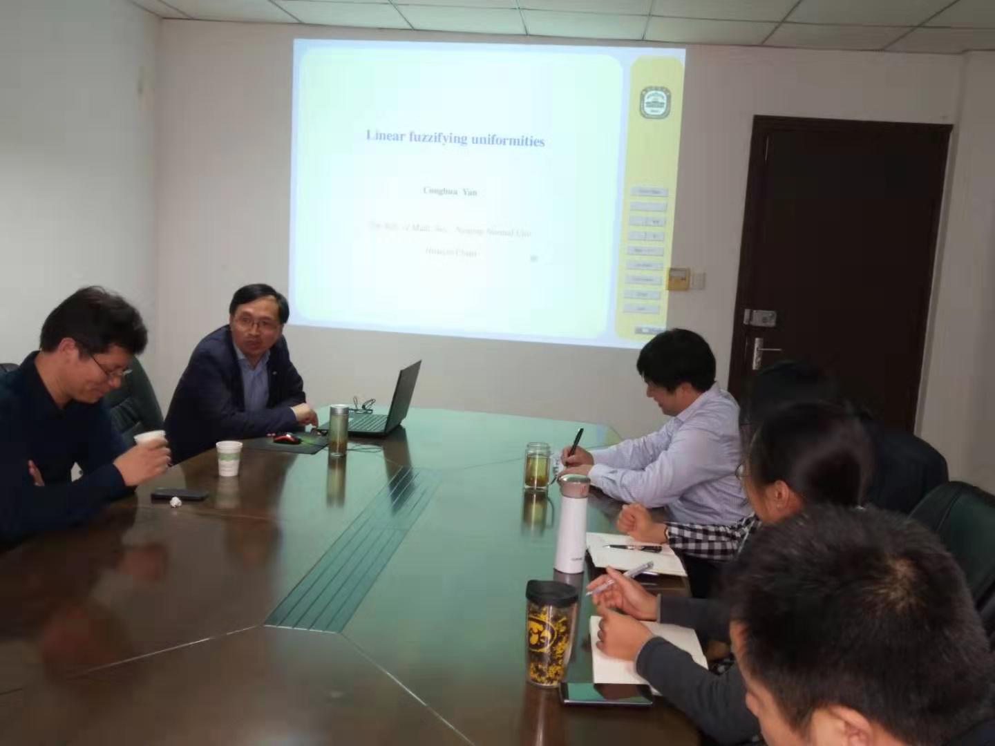 王雨顺教授在报告中, 介绍了常微分方程和偏微分方程保结构算法的基本概念、最新研究动态和一些典型应用,重点介绍了课题组在偏微分方程局部保结构算法方面的最新研究结果和若干应用。 严从华教授的报告主要介绍了在各种模糊拓扑空间中线性不分明化的一致性问题,并报告了本人的最新相关研究结果。