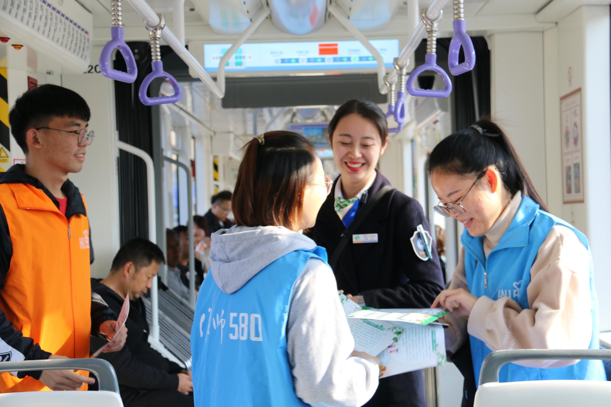 学生党员从学校出发到达有轨电车始发站,在车上向乘客发放宣传单,倡导市民积极进行垃圾分类,注重保护环境。一位学生党员说道:“进行垃圾分类收集可以减少垃圾处理量,降低处理成本,减少土地资源的消耗,有利于社会、经济、生态三方面的良性发展。建立良好的垃圾分类意识,可以使城市环境变得更加美好,人民生活更加幸福安康。”