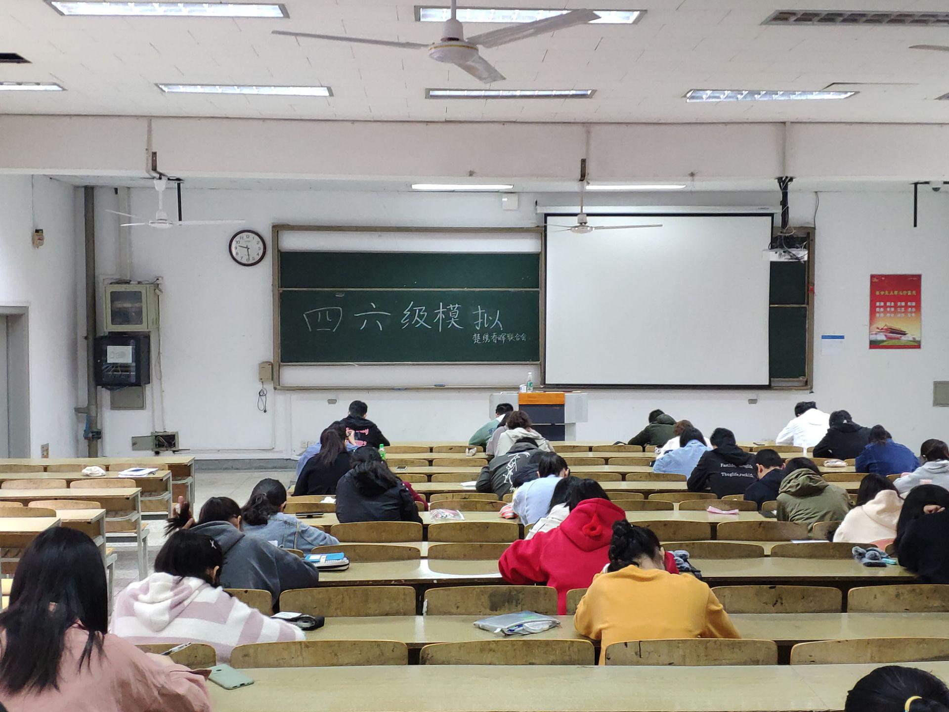 此次模拟考试严格按照全国英语四六级考试的标准执行。考试开始,考生按照座位号有序就坐,考试期间,考生奋笔疾书,认真严谨作答试题,全身心地投入。同学们都很珍惜楚绣春晖联合会的这次考试机会。