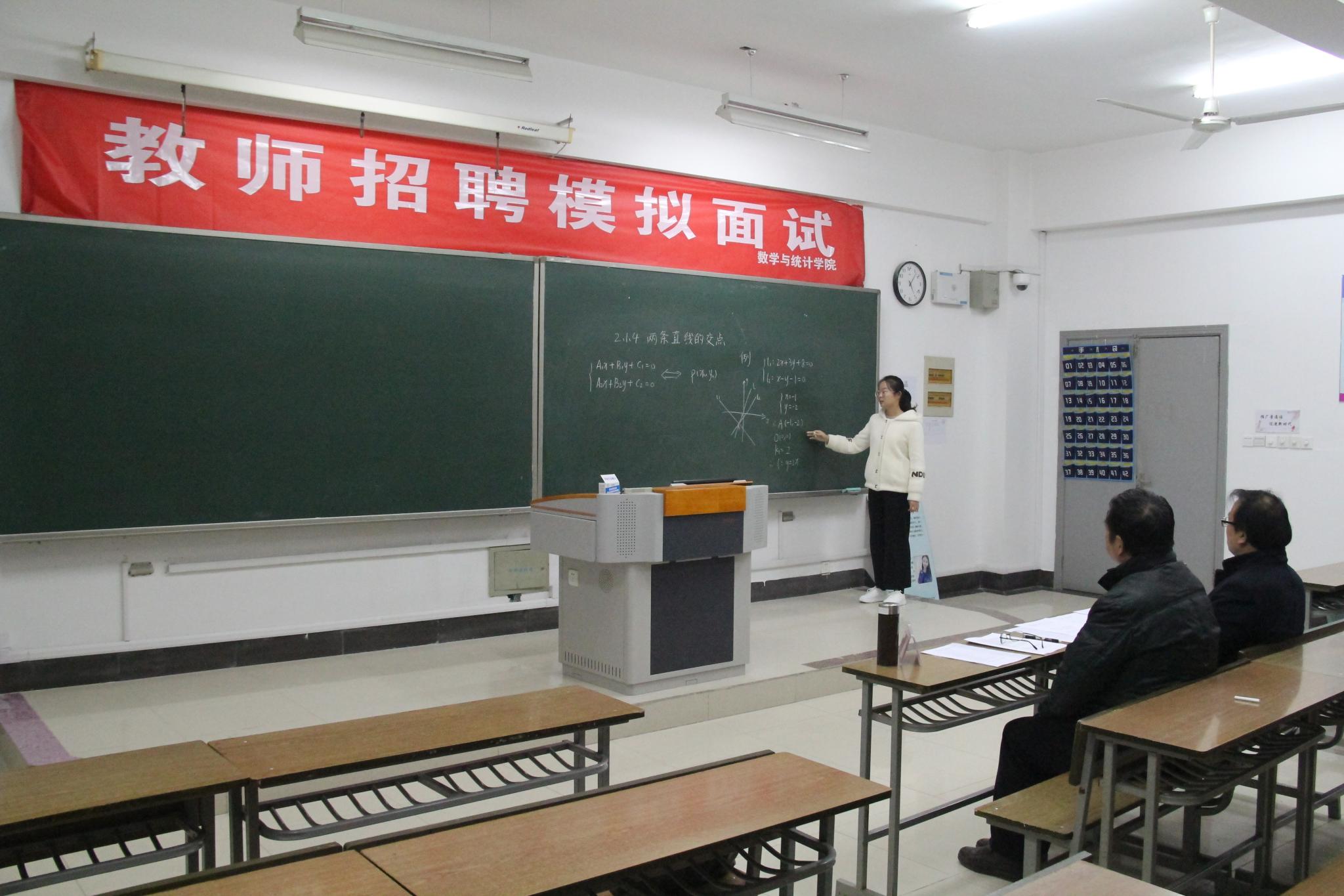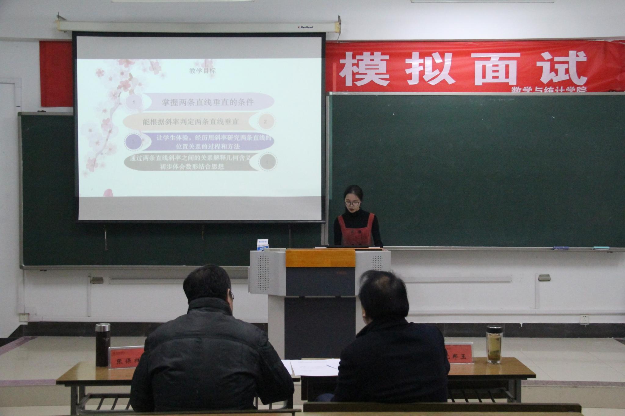 翔宇网12月5日电(记者 李琪琪 杨轲旭)为让师范生时刻以教师的标准要求自己,提高师范生专业素养,帮助师范生积累招聘面试经验,12月4日,数统学院在理南203组织开展教师招聘模拟面试。评委老师沈邦玉、张保祥应邀出席。