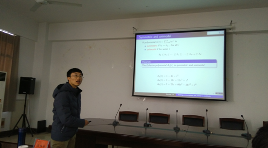 林志聪教授的报告介绍了经典排列统计量和欧拉多项式的gamma-非负性,并讲解了他与合作者关于Jacobi--Stirling排列上三元统计多项式的部分gamma-非负性猜想的证明。他从经典欧拉多项式的组合解释出发,详细介绍了猜想的背景和意义,然后讲解了证明中的两个关键步骤:陈氏文法和推广的Foata--Strehl群作用。他的报告深入浅出,颇富启发性,让各位教师受益匪浅。报告会在一片掌声中结束。