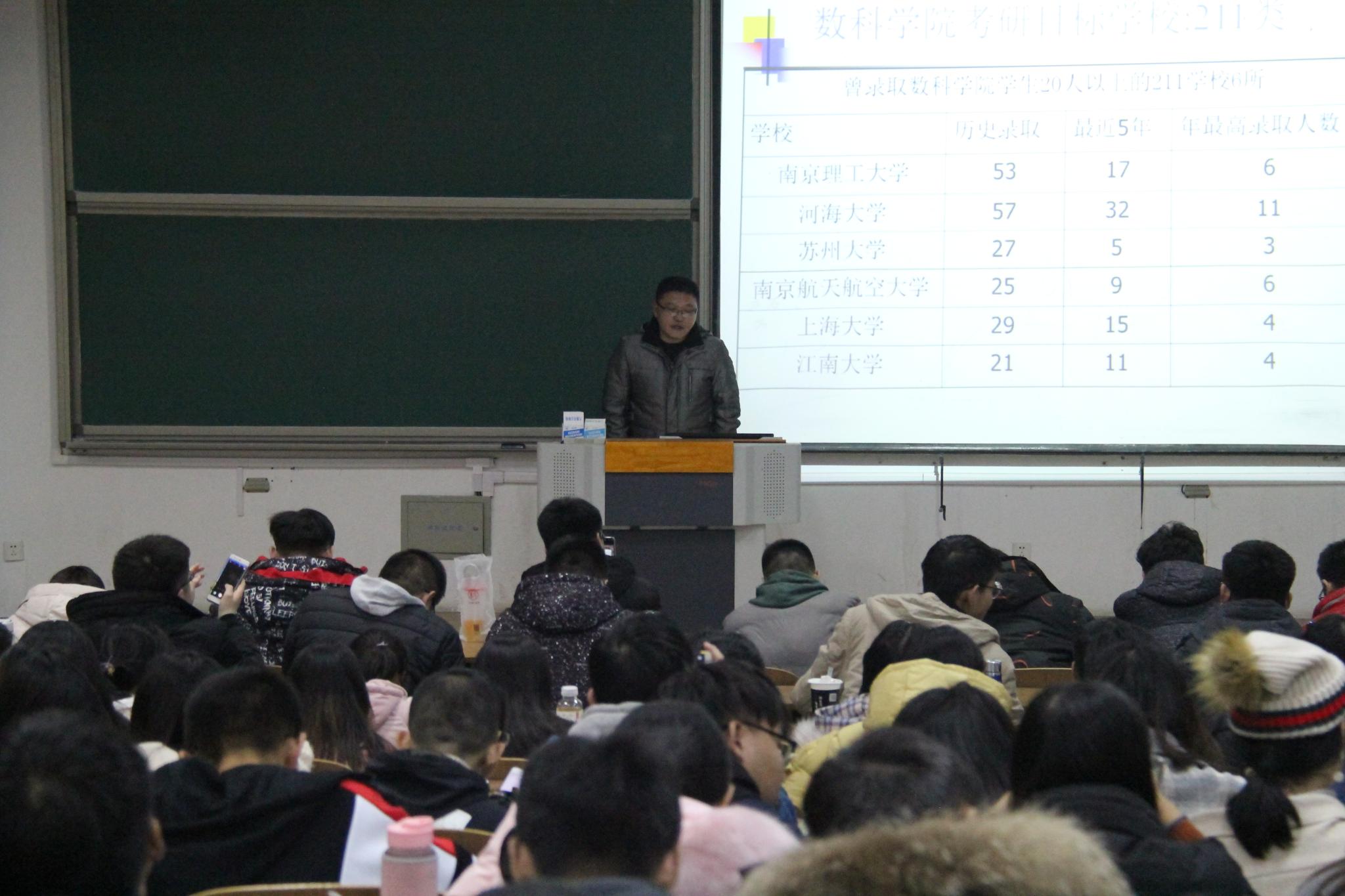 讲座伊始,郭嵩就江苏省整体的考研情况向同学们作了简要介绍,分析近年来的考研形势。他通过PPT向大家展示数统学院的各项考研数据,以便让学生更直观地整理汇总、选择考研方向。此外,郭嵩指出了数统学院在考研、择业就业等方面存在的问题。针对这些问题,他给出了具体的解决方案,提出了宝贵建议。
