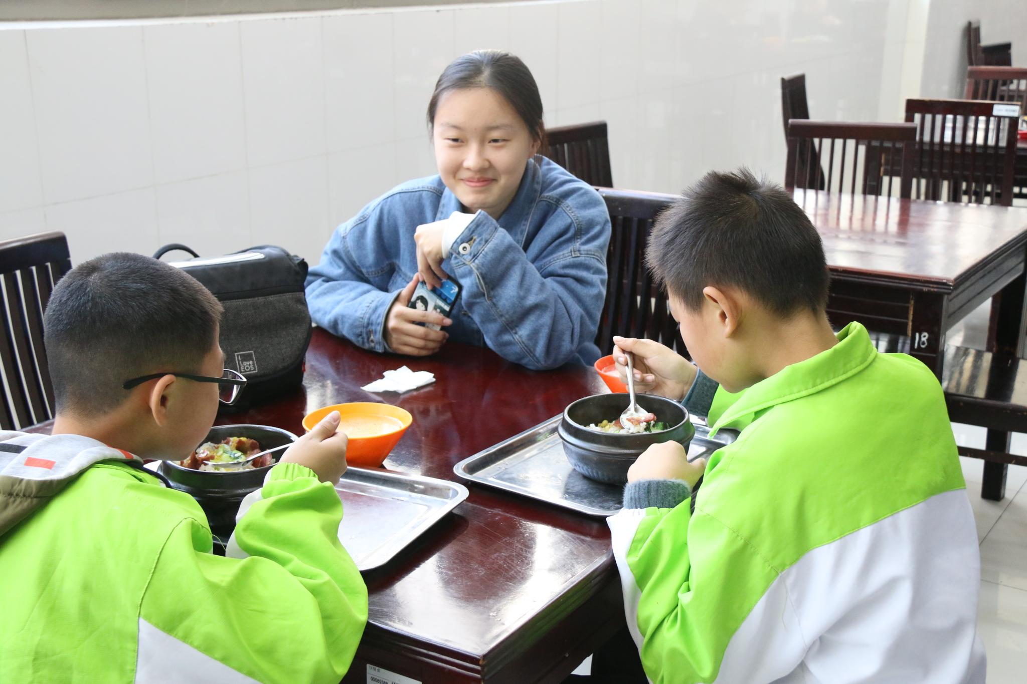 图为大学生带领中学生用餐。记者 王聚荃 摄