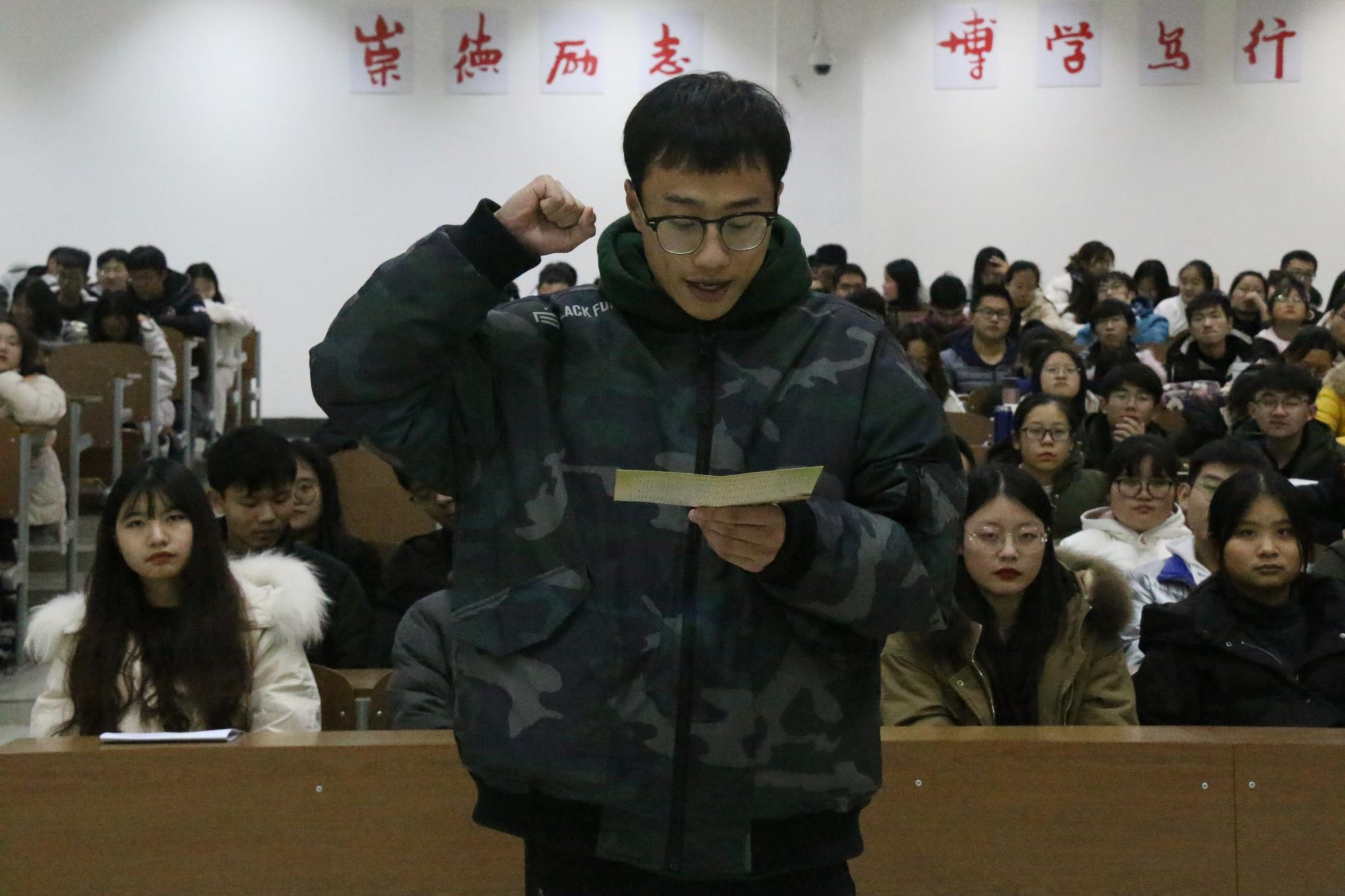 会议伊始,谢海燕简述考试纪律及考试违纪的相关处理办法,强调考风考纪的严肃性和重要性。她督促同学们认真复习,乐观自信地迎接期末考试。为进一步增强学生营造良好考风学风的意识,数统学院1904班鞠瑞现场宣读考试违纪的相关处理办法,1906班姚禹代表全院同学宣誓。随后,城环学院学生肖玢羽应邀参加大会,她就 “勤奋为实”“学会规划”“把握机会”三个方面,向2019级学生分享自己的学习经验;王柳以“数学分析”“初等数论”“解析几何”具体举例,提出宝贵的学习建议;黄兰则分享了自己的期末复习方法。