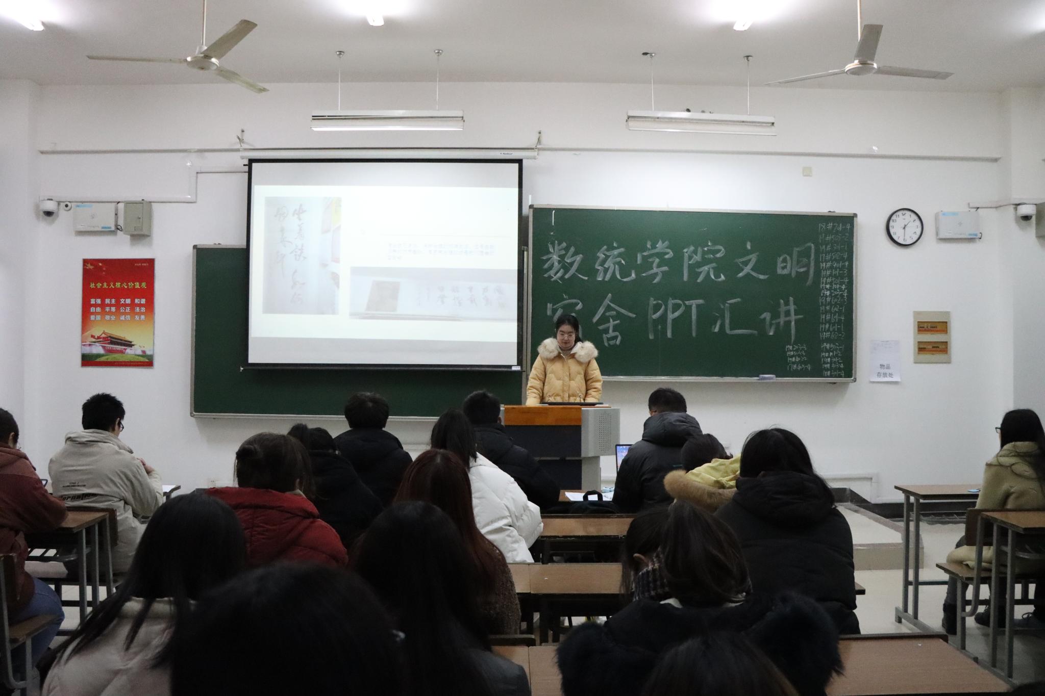 翔宇网12月10日电(记者 王康 陈芊羽)为创建和谐的宿舍环境,营造优良的学院学风,12月9日下午,数统学院在理南105、理南106开展院级文明宿舍PPT汇报活动。汇报活动由宿管部部长谢海萍主持。