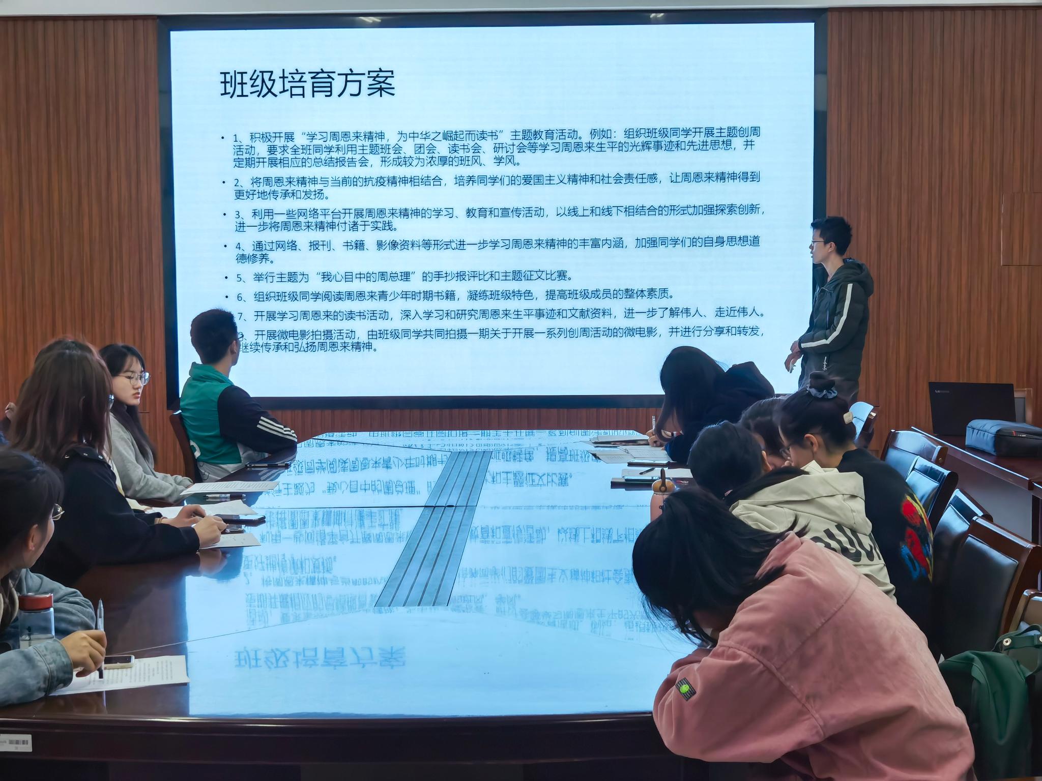 本次汇报工作由各班级团支书汇报展示周恩来班创建的情况,以及各班对于周恩来班创建的设想与当前完成进度。各班运用细致精美的PPT与条理分明的报告,从班级的基本情况、培育的具体措施、创建周恩来班的意愿等多方面进行汇报剖析。