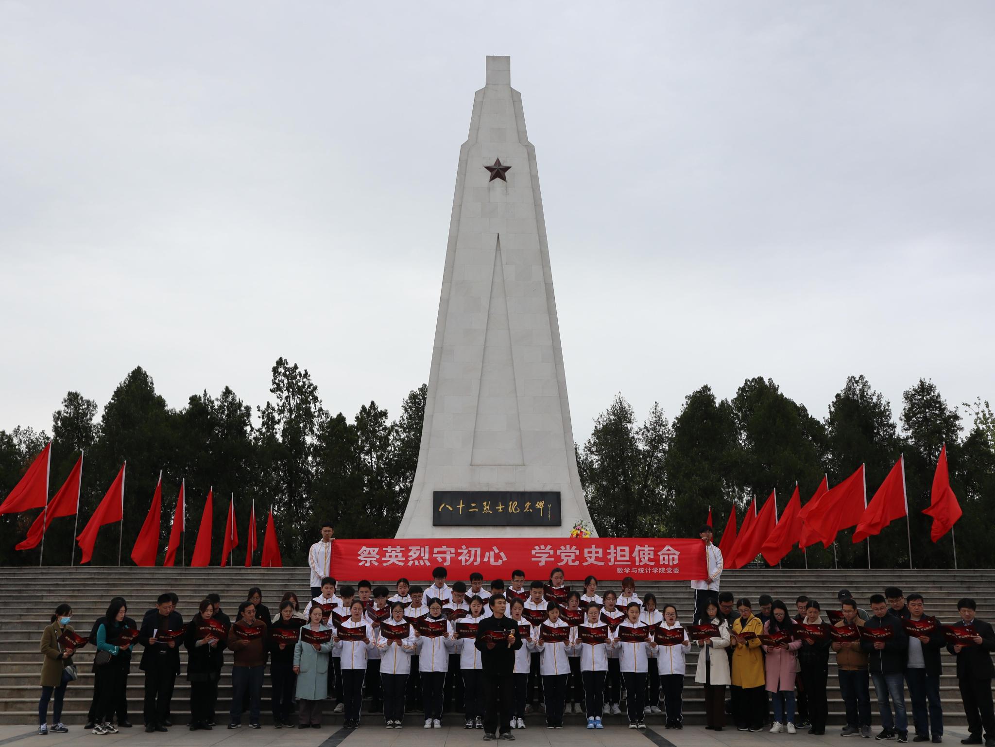 在刘老庄八十二烈士纪念碑前,全体师生党员整齐排开,向纪念碑敬献花篮,表达无限哀思。学院党委书记柏传志、教师党员代表张海辉与学生党员代表许胡莹先后发言,表明要坚定革命理想信念,不忘初心、牢记使命,沿着革命先烈红色足迹,传承红色基因,奋进新时代。随后,在退休党员教师代表马强老师带领下,学生们朗诵马老师创作的诗歌《忠烈英魂祭》,用最朴实的语言、最深情的朗读,表达对先烈的崇敬以及对党的热爱。“我志愿加入中国共产党,拥护党的纲领……”全体党员师生面对鲜红的党旗,庄严地高举右拳,重温入党誓词,表达为共产主义奋斗终身的坚定决心。