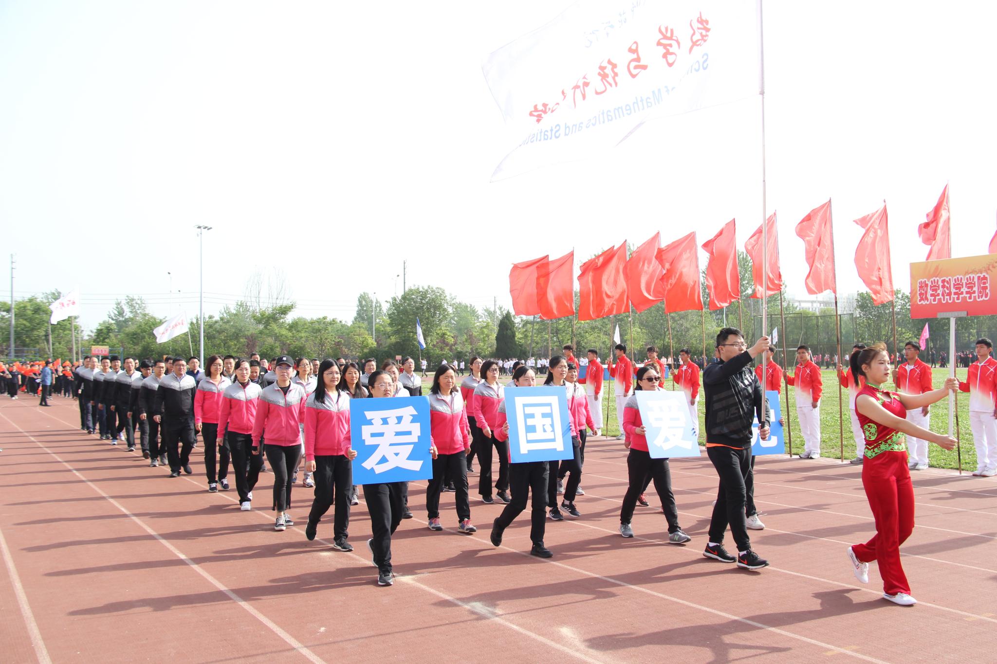上午八点整,各方阵整装待发。数统学院的男女老师们身着统一的运动服,高举着“爱国爱党”的牌子,气势昂扬地走过主席台前,用整齐的步伐踏出他们的坚定,灿烂的微笑写满他们的热情。