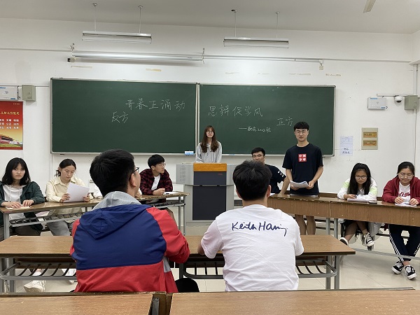 翔宇网5月11日电(记者 邵帅 史蘋)应积极响应学院庆祝党百年诞辰的号召,数统2002班在5月10日举办了“青春正涌动,思辨促学风”主题班级辩论赛活动。辩论赛以网络普及对大学生的影响为辩题,激起同学们对自己的反思的监督并进一步促进班级积极向上的学风发展。