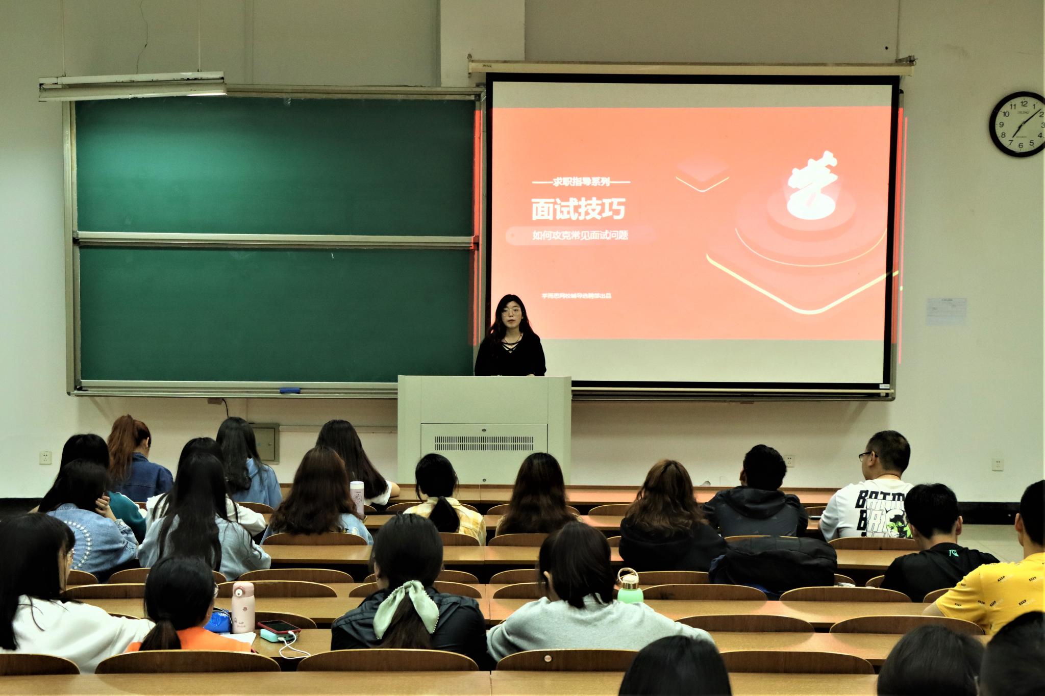 讲座伊始,金老师就大学生总体在面试技巧上的不足及求职困扰进行了分析,从结构化面试、非结构化面试及半结构化面试的方面,启发同学们灵活地应对不同的面试问题。紧接着,金老师以胜任力为切入点,把单面面试问题和群面面试问题归为背景性问题、理论性问题、动机性问题、情境性问题及行为性问题,并逐个用具体事例加以分析,加深了同学们对于面试素养的理解。最后,金老师强调了表达内容中细节的重要性,以帮助学生更深入地注重细节对于面试成败的影响。