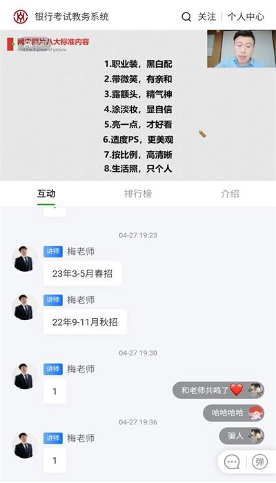 本次讲座主要从当下大学生就业形势及行业分析、如何进行职业规划、简历制作方法指导和面试十大技巧指导四个方面开展。会议伊始,梅高翔老师进行了简单的自我介绍,接下来,梅老师从“稳、高、多”三方面阐释了从事金融工作的优点。他指出,高端金融行业的最佳跳板,考银行是聪明的选择。围绕这一主题,梅老师列举了银行招聘六大概述:5类银行、1个招聘、2个时间、6个特点、4个岗位及5个流程,并用生动鲜活的学生案例论证阐述了六大概述的具体要义。讲座最后,梅老师通过以往真题的讲解,引导同学们对银行招聘进行更加深入的思考,为同学们能够成功考取银行增添了动力。同学们在线上讲座中和梅高翔老师积极互动,感悟良多。