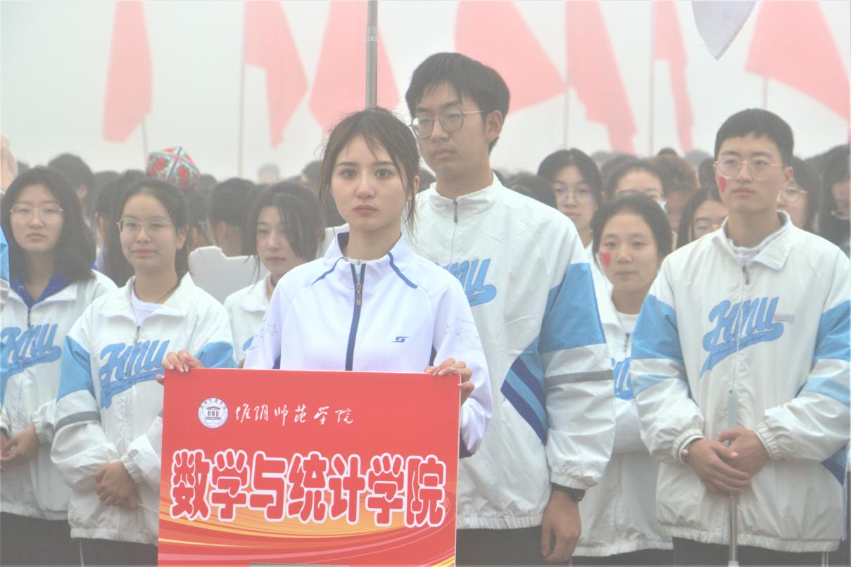 伴随着振奋人心的《运动员进行曲》,国旗队、校旗队、会徽方阵、彩旗方阵、裁判方阵、研究生方阵和各二级学院方阵依次入场。数统学院的学子们身着统一服装,迈着整齐的步伐,意气风发、朝气蓬勃。高喊出“舞动激情,放飞梦想;团结拼搏,树我雄风”的口号,彰显出数统学子蓬勃向上的青春气息,也向全校师生呐喊出他们内心最炙热的情怀。最后他们高举“请党放心,强国有我”的横幅,用“愿以吾辈之青春,护卫盛世之中华”的决心,诠释出对国家发展的责任与担当。数统学院方阵的同学们以“指点江山,激扬文字”的豪情壮志,“挥洒汗水,追逐梦想”的锐意进取,向全校师生演绎出数统学院永不言败的运动精神。表演结束,数统学院方阵获得了全场师生的掌声与肯定。