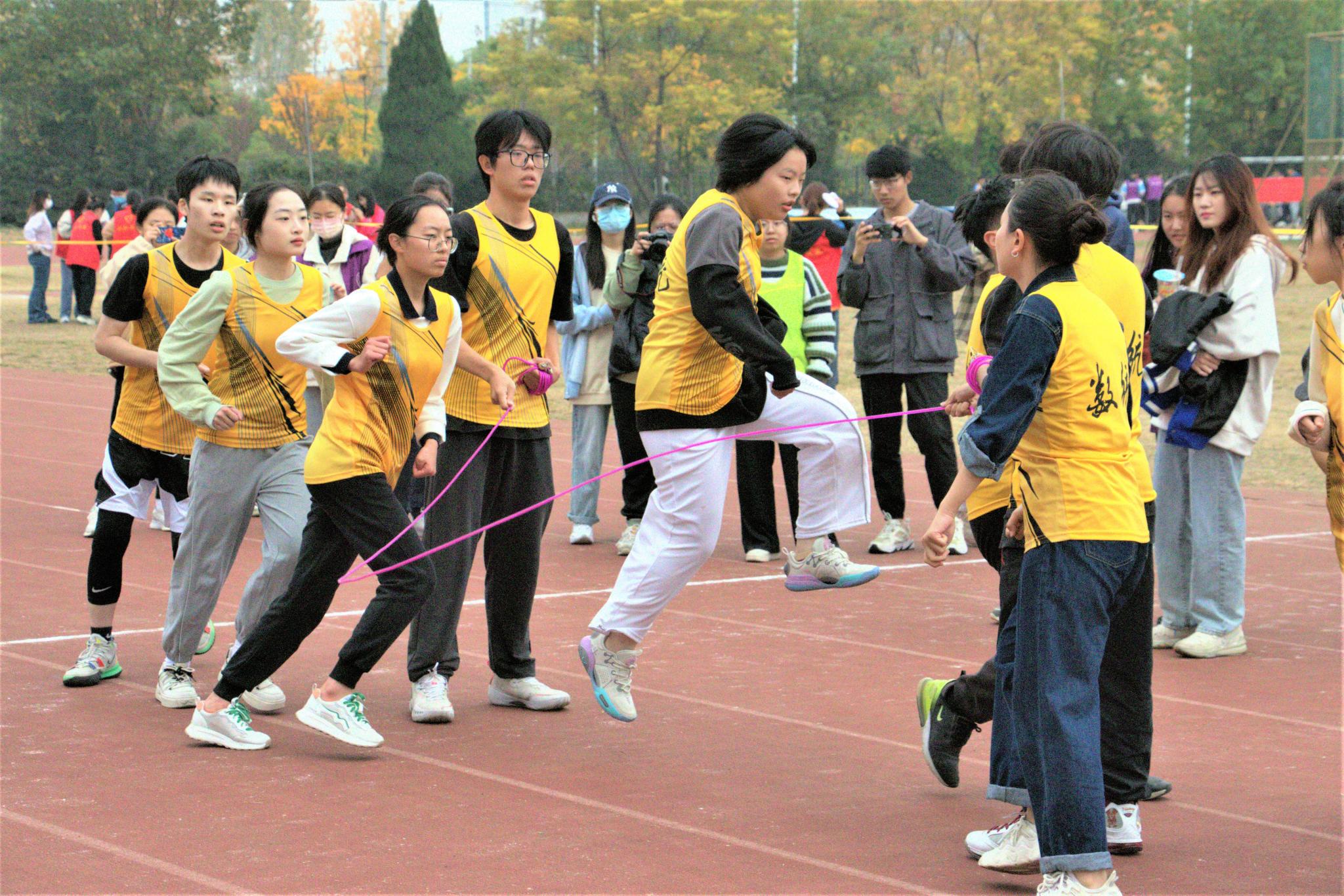 接下来是下饺子比赛,运动员们个个摩拳擦掌,屏息凝神。哨声吹响,摇绳的同学双手紧紧攥住绳子,他们手里的绳子像彩环似的飞舞起来。绳子打在地上发出“啪,啪”有节奏声音,跳绳同学目光坚定全神贯注地望着绳子弹落地点,找准时机,钻入舞动的长绳中,后面的同学鱼贯而入。长哨响起,下饺子比赛落下帷幕,数统学院以248个的优异成绩,成功在跳绳下饺子项目蝉联冠军,并且打破了纪录。